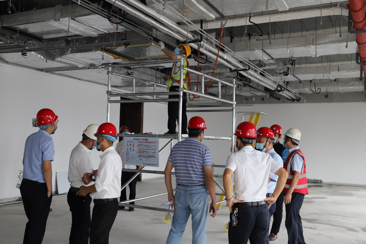 在交流结束之后,参会人员一起前往广电金融中心大厦27层进行现场观摩,观摩现场设置了玻璃钢人字梯、移动操作架、安全绳等高空作业设备品的规范使用操作,让参加观摩的人员了解这些设备正确使用方法。